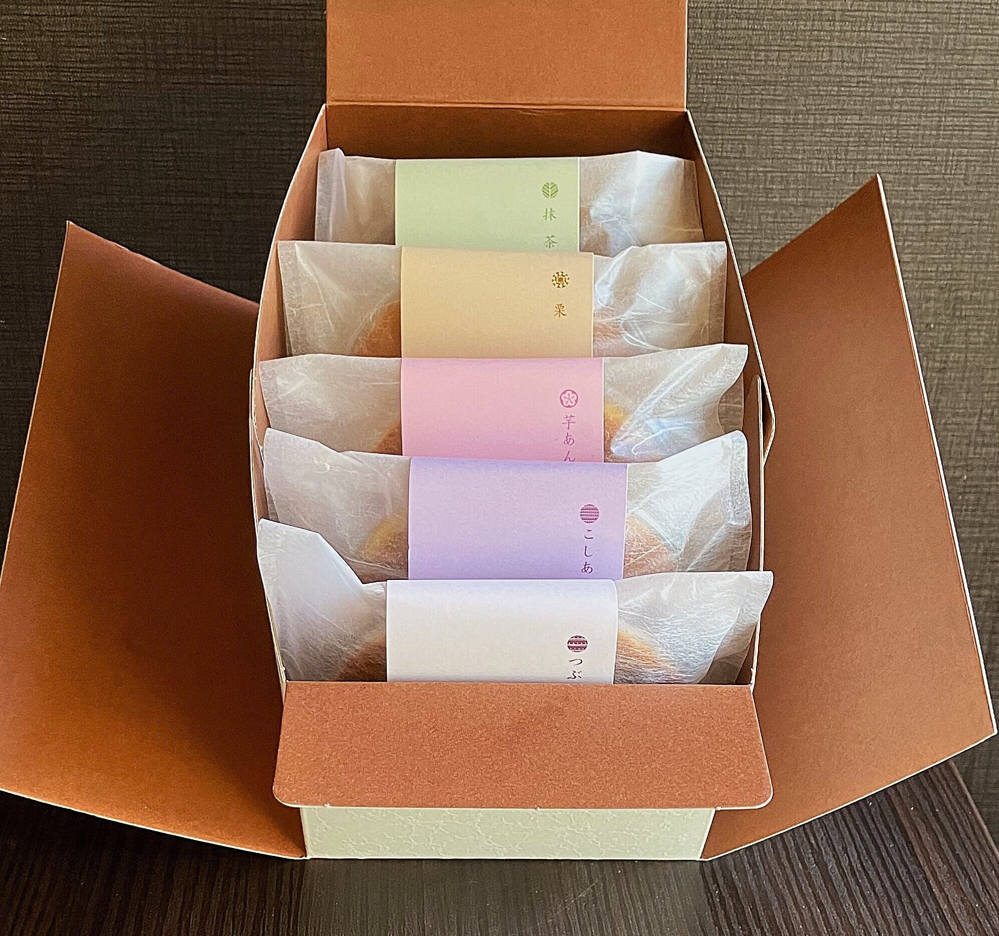 定番「どら焼き」である、つぶあん、こしあん、芋あん、栗、抹茶の5種類を詰め合わせたギフトセットで、お店でも人気のセットです。賞味期限は、発送日から14日間、常温で日持ちしますので、大切な方へのギフトやお祝いにおススメです。巻紙はたくさんの色からお選びいただけます。※紙袋も付いています。